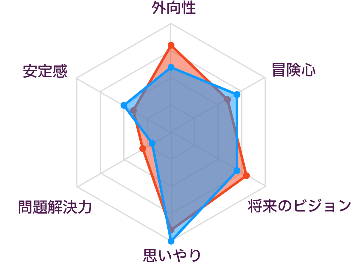 この二人はE(外向)とI(内向)、PとJが異なるため、同じものに興味を持ち、価値観も似ているのですが、全く違った人間のように感じます。
