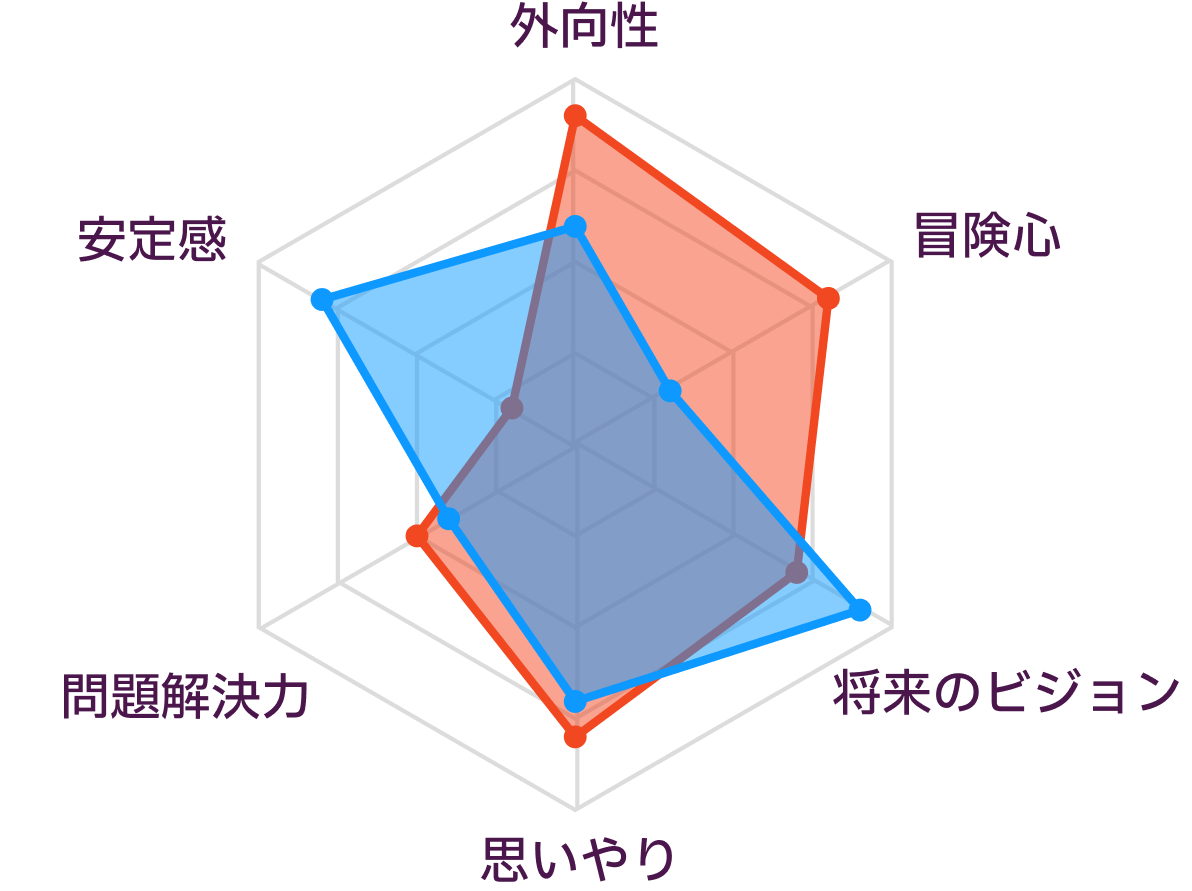 この二人はE(外向)とI(内向)、PとJが異なるため、同じものに興味を持ち、価値観も似ているのですが、全く違った人間のように感じます。