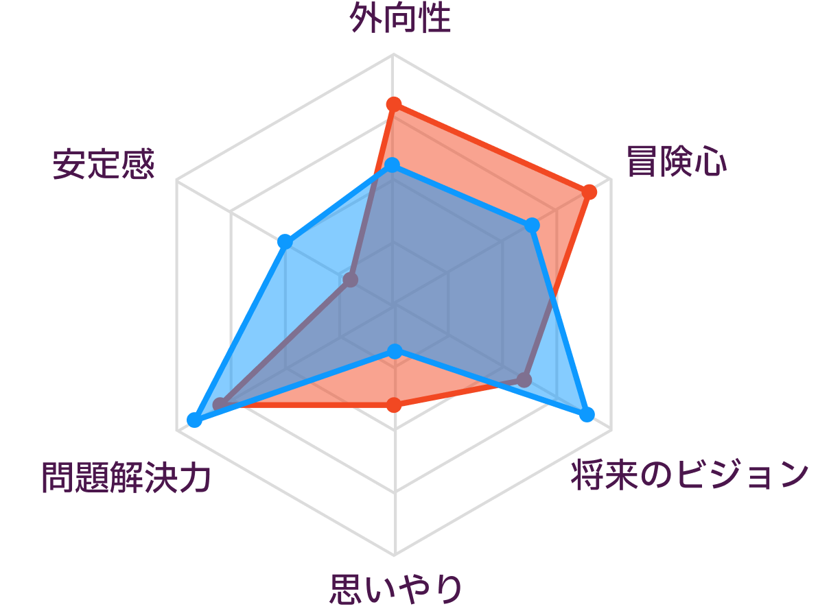 この二人はP(知覚)とJ(判断)以外の全てが同じのため、一見、性格はかなり類似しているように見えます。そのため初対面から一気に仲良くなることも多いです。