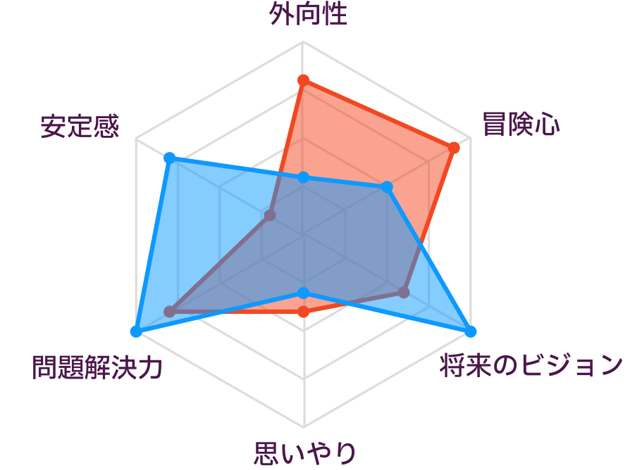 この二人はE(外向)とI(内向)、PとJが異なるため、同じものに興味を持ち、価値観も似ているのですが、全く違った人間のように感じます。