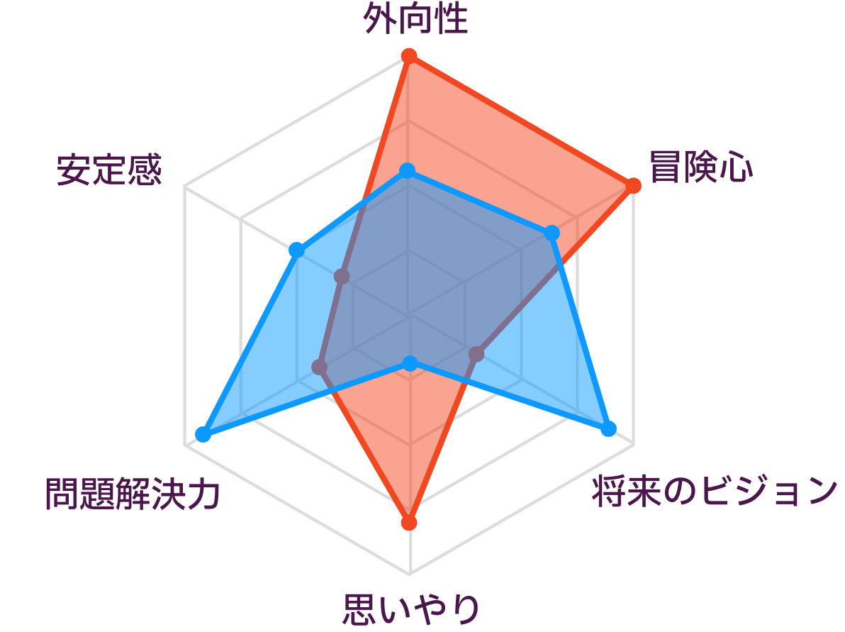 この二人はE(外向)とI(内向)のみが一緒のため、一見異なるように見えますが、全相性の中で関係の構築が最も簡単です。