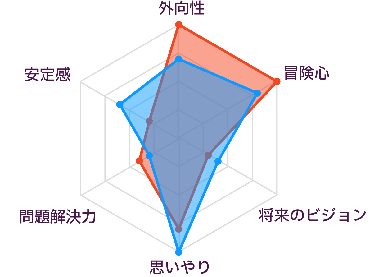 この二人は非常に似た者同士であり、違いはE(外向的)かI(内向的)かのみです。利用している性格の機能は全て同じですが、得意なものと、不得意なものは異なります。
