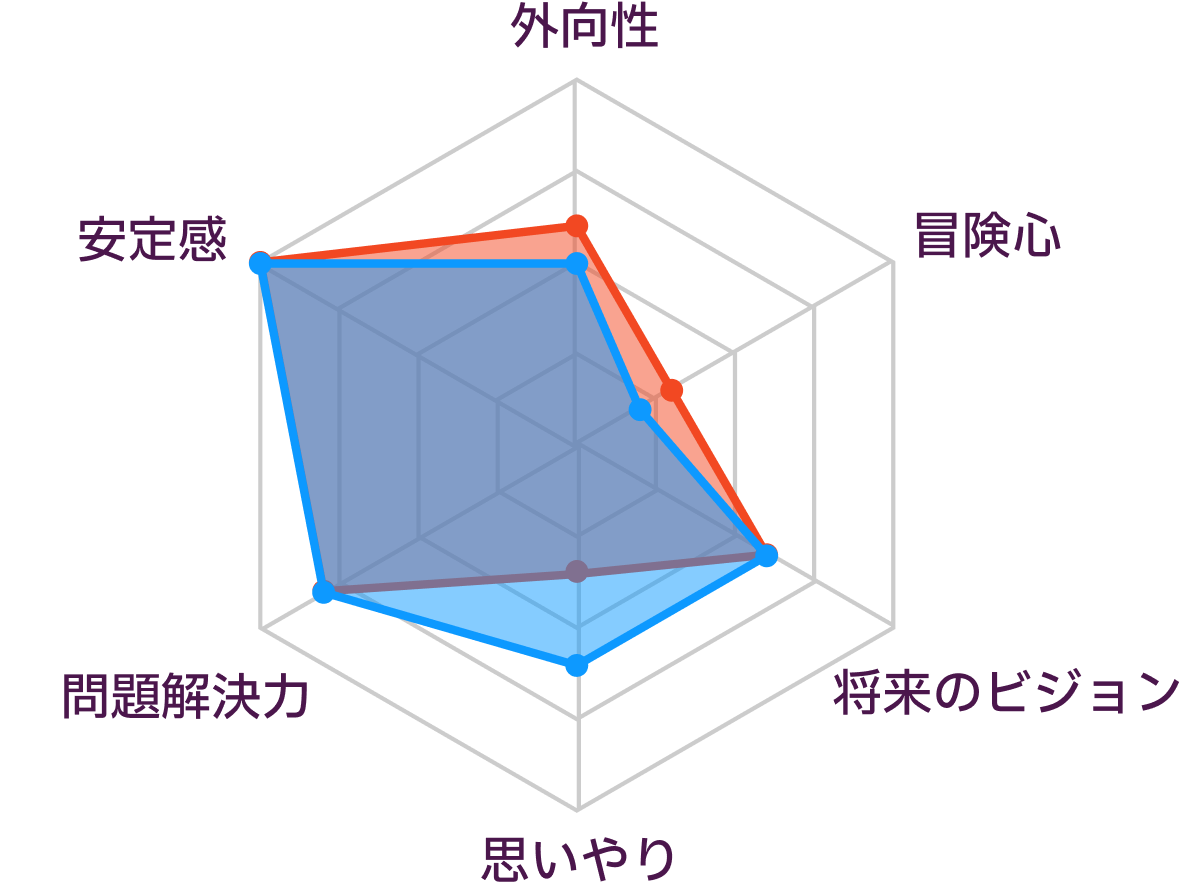この二人は非常に似た者同士であり、違いはE(外向的)かI(内向的)かのみです。利用している性格の機能は全て同じですが、得意なものと、不得意なものは異なります。